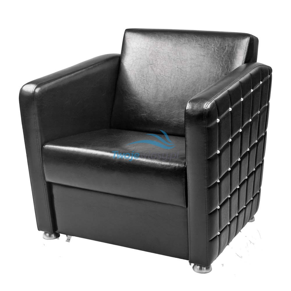Fotel do poczekalni GLAMROCK jest w całości tapicerowany, a jego zewnętrzną część pokrywa pikowanie i srebrne ćwieki.