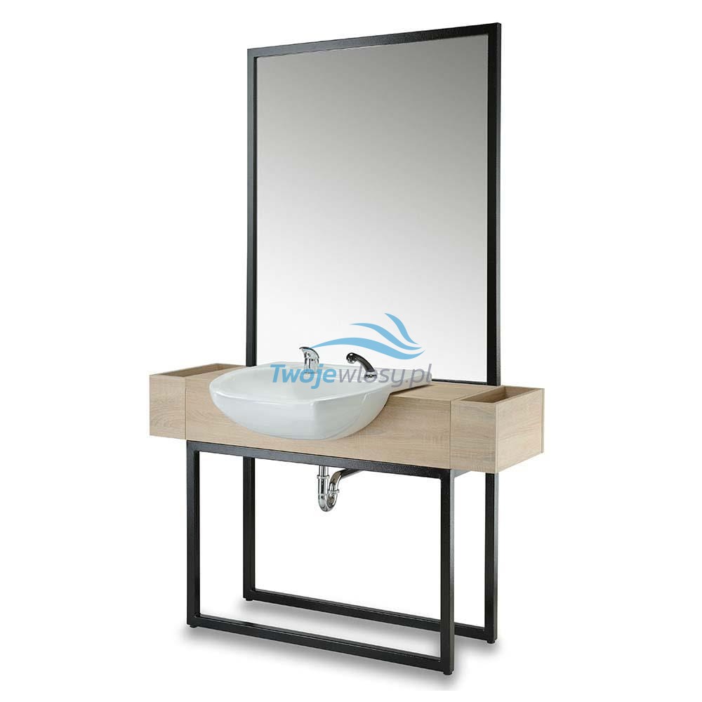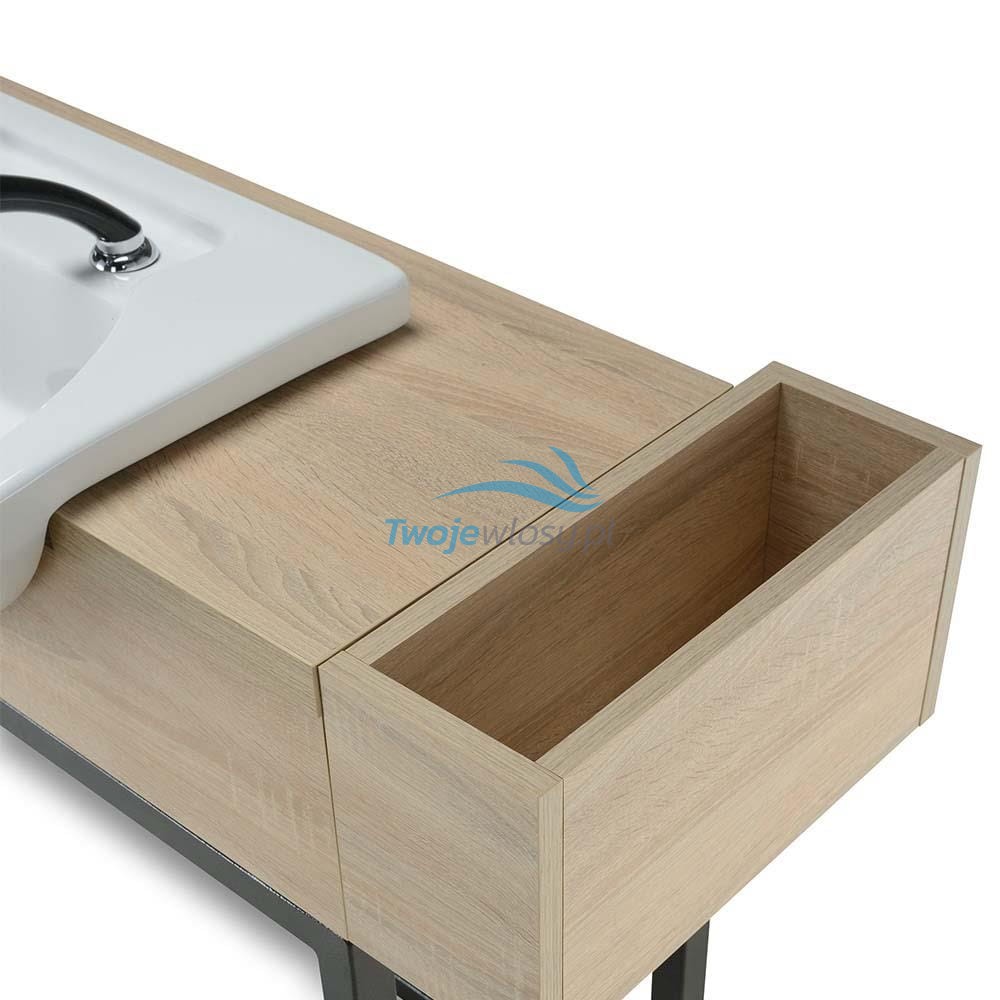 Konsoleta barberska CRUDO 1-stanowiskowa z umywalką – choć prosta w formie i stworzona z wykorzystaniem metalu polakierowanego na kolor czarny oraz płyty meblowej z laminatem imitującym drewno jest niezwykle elegancka. Mimo tego, że całość korpusu wygląda masywnie, to za sprawą podstawy o subtelnej linii, ale jednocześnie wytrzymałej konstrukcji, bryła nabiera lekkości i nie przytłacza swoim zdecydowanym wyglądem. Jej surowy styl nie odbiera jej także żadnego z elementów idealnej funkcjonalności, która jest istotna w wymagającej pracy fryzjera. Konsoleta barberska to wysokiej jakości mebel, który jest jednocześnie stanowiskiem do mycia głowy. Po umyciu klientowi głowy tyłem do lustra, odwracamy go na fotelu, aby mógł obserwować w lustrze postępy strzyżenia. Płyta laminowana do wyboru według wzornika – pięknie imituje wygląd naturalnego drewna włącznie z fakturą słojów na powierzchni, dodatkowo jest bardzo odporna na zarysowania i temperaturę (mebel będzie bardzo długo wyglądał jak nowy).