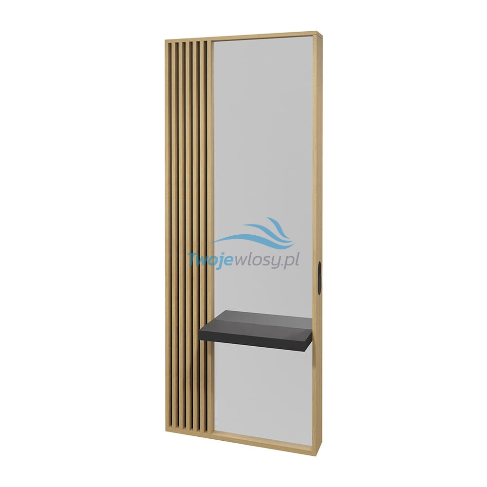 Konsoleta prosta w formie i stworzona z płyty meblowej z laminatem imitującym drewno. Mimo tego, że całość korpusu wygląda masywnie, to za sprawą lameli, bryła nabiera lekkości i nie przytłacza swoim zdecydowanym wyglądem. Konstrukcja posiada idealną funkcjonalność, która jest istotna w wymagającej pracy fryzjera. Płyta laminowana do wyboru według wzornika – pięknie imituje wygląd naturalnego drewna włącznie z fakturą słojów na powierzchni, dodatkowo jest bardzo odporna na zarysowania i temperaturę (mebel będzie bardzo długo wyglądał jak nowy).
