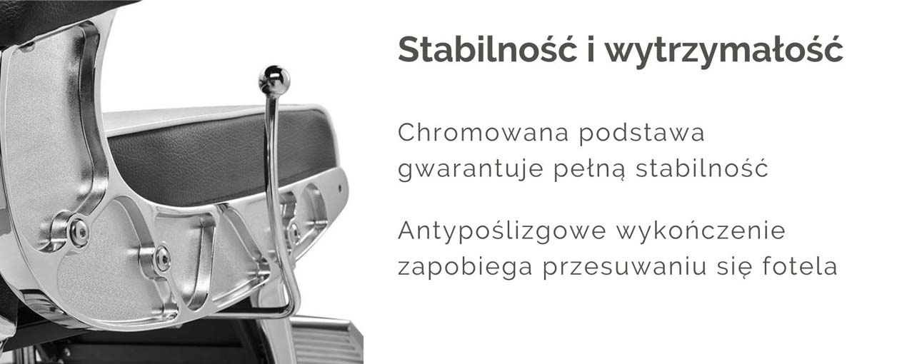 Solidna chromowana podstawa gwarantuje pełną stabilność nawet podczas intensywnego użytkowania. Antypoślizgowe wykończenie zapobiega przesuwaniu się fotela, co zwiększa bezpieczeństwo pracy. Konstrukcja fotela jest odporna na codzienną eksploatację, co czyni go idealnym wyborem dla profesjonalnych salonów.