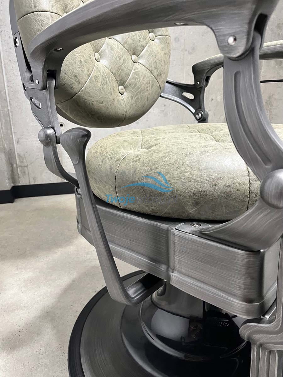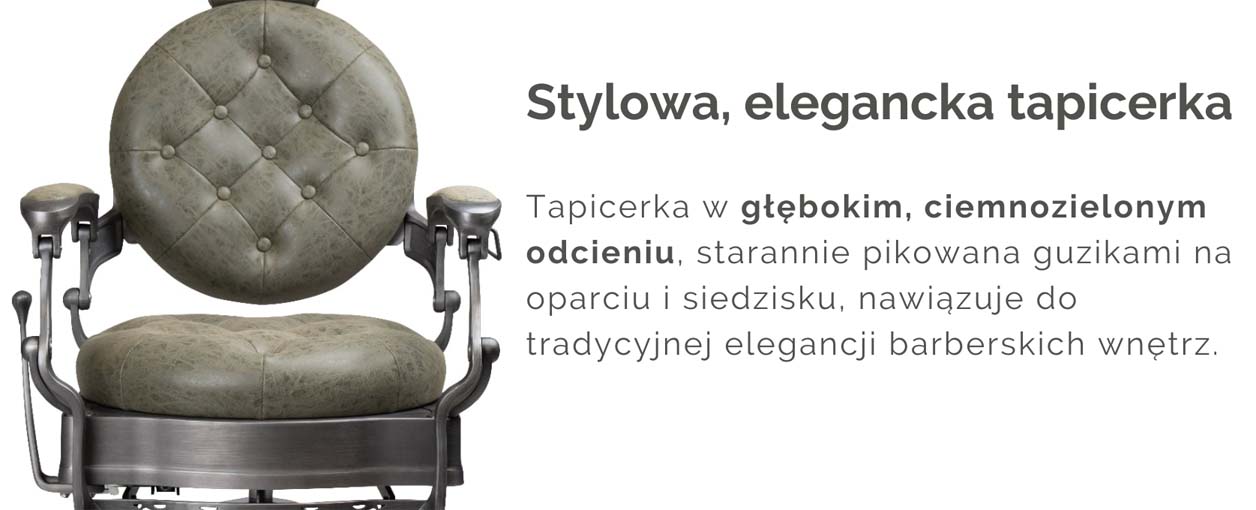 Fotel Royce Emerald wyróżnia się niezwykle stylowym wyglądem, który przyciąga wzrok i nadaje wnętrzu ekskluzywnego charakteru. Jego tapicerka w głębokim, ciemnozielonym odcieniu, starannie pikowana guzikami na oparciu i siedzisku, nawiązuje do tradycyjnej elegancji barberskich wnętrz. To rozwiązanie nie tylko estetyczne, ale także praktyczne – zapewnia wyjątkową trwałość i odporność na codzienną eksploatację.