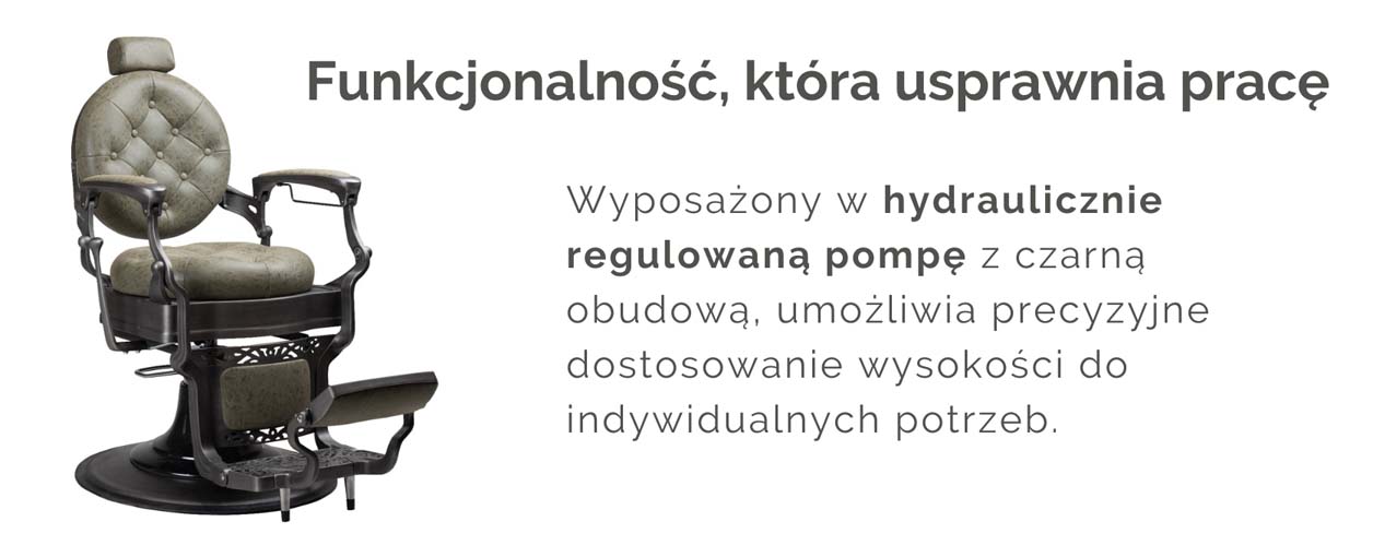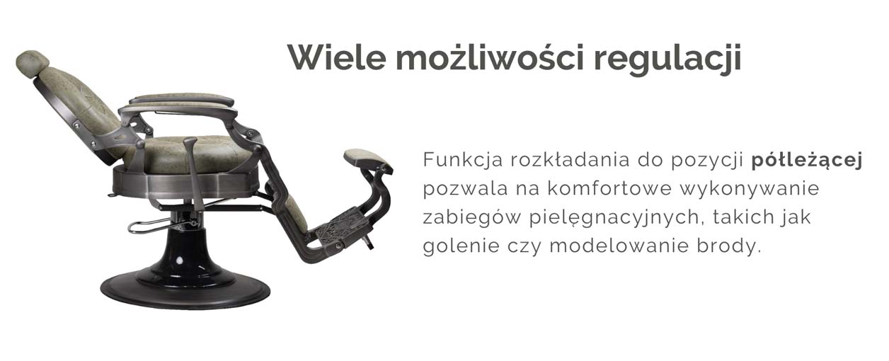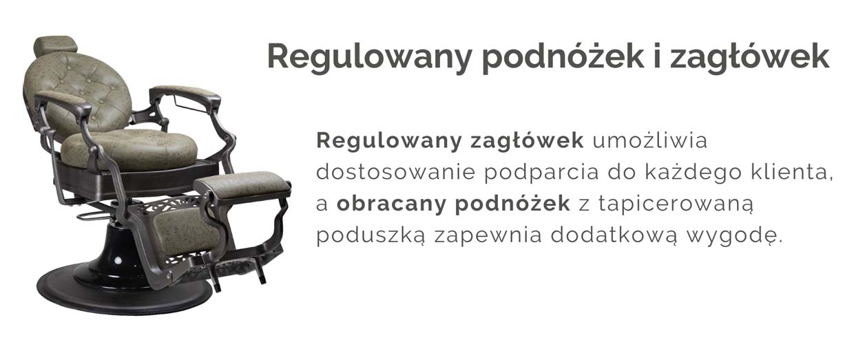 Funkcja rozkładania do pozycji półleżącej pozwala na komfortowe wykonywanie zabiegów pielęgnacyjnych, takich jak golenie czy modelowanie brody. Regulowany zagłówek umożliwia dostosowanie podparcia do każdego klienta, a obracany podnóżek z tapicerowaną poduszką zapewnia dodatkową wygodę. Dodatkowo metalowa część podnóżka została wyposażona w ryflowanie, które zapobiega ślizganiu się obuwia i podnosi bezpieczeństwo użytkowania.