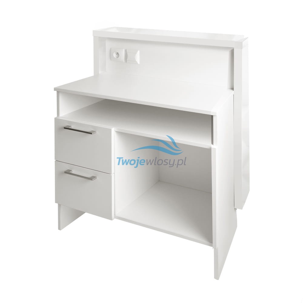 Recepcja wykonana z płyty akrylowej lakierowanej na wysoki połysk, front wykonany z plexi posiada oświetlenie LED. Dostępna od ręki w kolorystyce zaprezentowanej na zdjęciu. Wys. 110 cm x Szer. 80 cm x Gł. 55 cm.