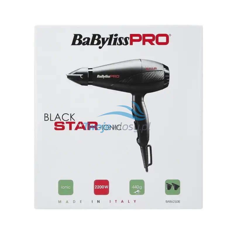 BaByliss Pro Black Star Ionic to wydajna profesjonalna suszarka o mocy 2200 W, która została wykonana we Włoszech, która posiada trwały silnik AC zapewniający prędkość powietrza 120 km/godzinę i tym samym szybkie rezultaty suszenia.
