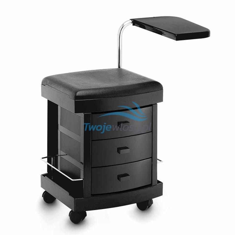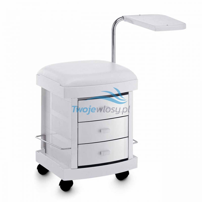 Mani Master Excel mobilne stanowisko do manicure idealne rozwiązanie dla profesjonalistów, którzy cenią sobie wygodę, mobilność i praktyczne rozwiązania w swojej pracy. Dzięki przemyślanej konstrukcji łączy funkcję wygodnego siedziska dla stylisty oraz praktycznego wózka do przechowywania narzędzi i akcesoriów do manicure. Solidny i elegancki wykonany z wtryskiwanego tworzywa ABS. Wyposażony jest w tapicerowane siedzisko, 3 eleganckie szuflady z uchwytami, które chronią narzędzia przed kurzem oraz praktyczną regulowaną obrotową tacką.