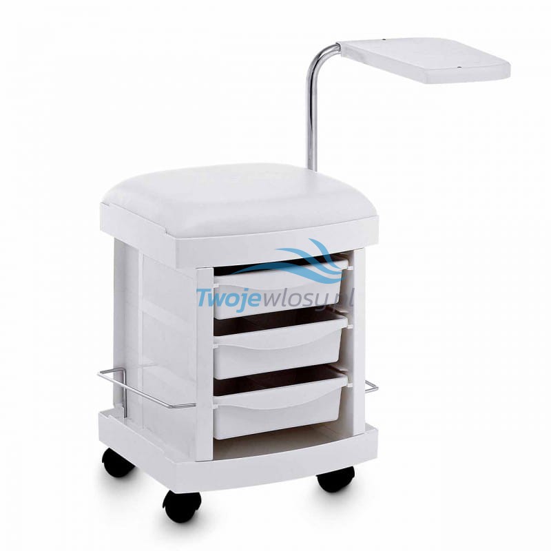 Profesjonalny wózek do manicure Mani Master posiada solidną konstrukcję z tworzywa ABS zapewnia trwałość i odporność na uszkodzenia. Jest niezbędnym narzędziem w pracy kosmetyczki. Siedzisko jest wyściełane i pokryte odporną skórą ekologiczną. Posiada 3 szuflady do przechowywania narzędzi potrzebnych do wykonania zabiegu manicure. Wysokość tacy można regulować, a kółka umożliwiają szybkie przemieszczanie jej z jednego miejsca do drugiego. Nasz Mani Master to niezastąpione wyposażenie każdego salonu kosmetycznego.