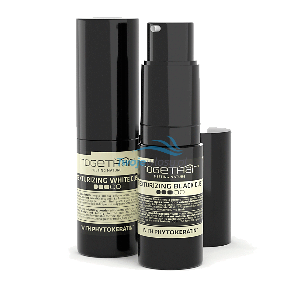 TOGETHAIR Texturizing Black Dust - puder zwiększający objętość włosów, średnio utrwalający, dający matowe wykończenie. Specjalnie zaprojektowany do włosów w odcieniach od ciemnego kasztanu po czerń. Produkt jest szczególnie polecany do włosów cienkich, płaskich i pozbawionych struktury, nadając im pełną objętość od nasady aż po końce.