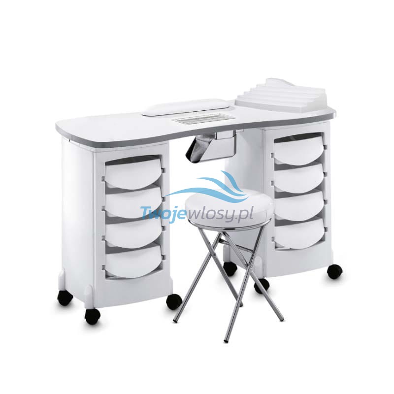Dwie praktyczne szafki z czterema dużymi szufladami umożliwiają przechowywanie wszystkich niezbędnych akcesoriów do manicure i stylizacji paznokci. Dodatkowo stolik wyposażony jest w wygodną poduszkę pod dłoń oraz ekspozytor na lakiery, co ułatwia organizację pracy.