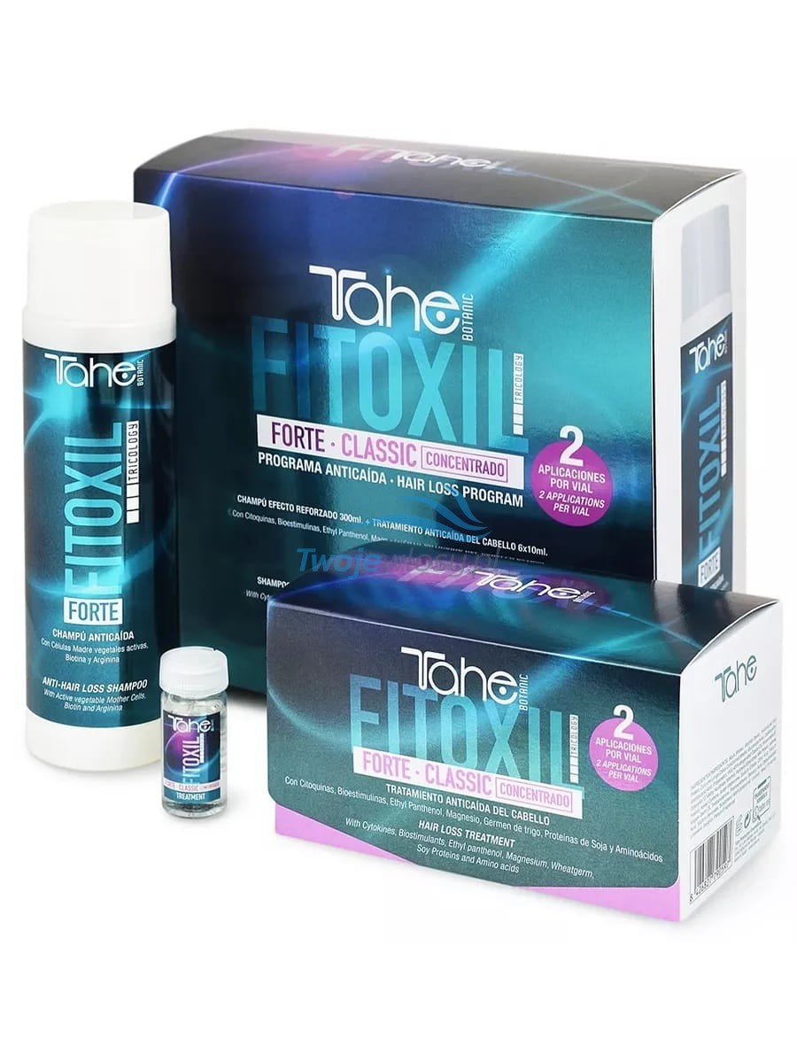 Tahe Fitoxil Classic Zestaw Przeciw Wypadaniu Włosów - szampon 300 ml oraz ampułki 6x10ml. Zawarte w produkcie aktywne składniki hamują wypadanie włosów. Regularne stosowanie powoduje, że włosy są silniejsze, gęstsze i lepiej odżywione.