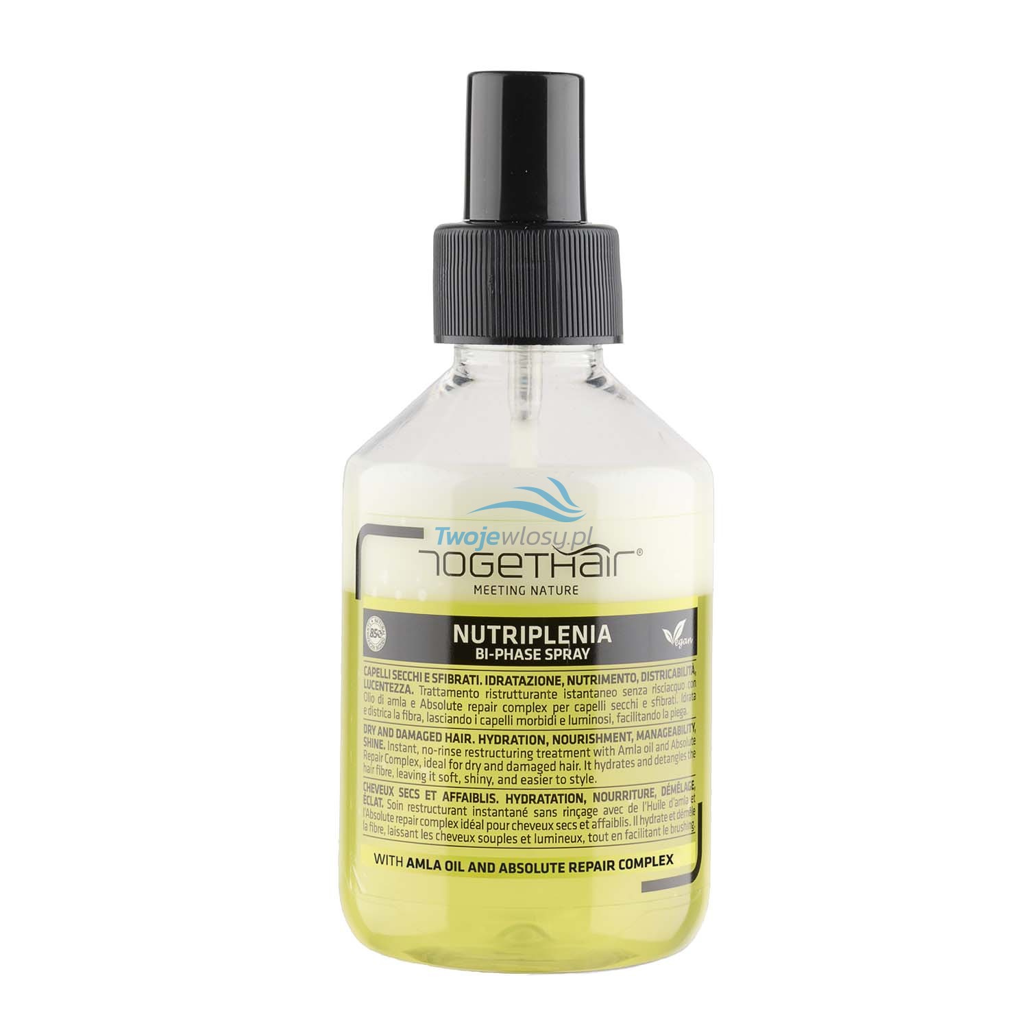 Togethair NUTRIPLENIA BI-PHASE Spray to dwufazowa odżywka bez spłukiwania, idealna do włosów suchych i łamliwych. Intensywnie nawilża, odbudowuje i ułatwia rozczesywanie, pozostawiając włosy miękkie, lśniące i łatwe do układania. Szybka kuracja regenerująca z olejkiem Amla dla zdrowych, pełnych blasku włosów każdego dnia.